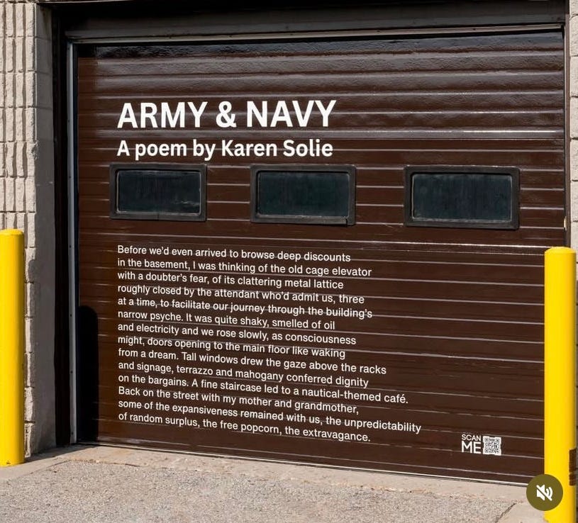 I don’t know what’s to become of the poem. In addition to its subject, the commission involved a line limit and other structural considerations. I don’t know whether a revision might make its way into a collection. Maybe the poem is just a bit of ephemera, like a flyer from the Army & Navy’s last sale. Maybe it’s meant to gradually fade away on a garage door in Markham.