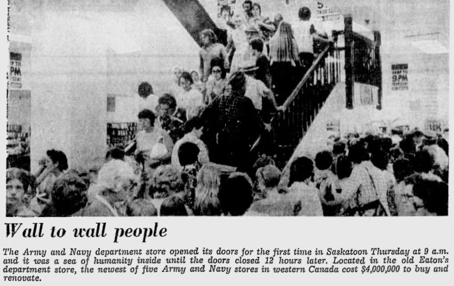 But I didn’t find it. Or it didn’t find me. Or it did and on waking evaporated. I remember the elevator pretty clearly in a conscious state, if perhaps as more Lynchian than it actually was. I remember the grandeur of the building, the outrageous fun of a department store café. I wondered at one point whether I was conflating the bargain basement of Army & Navy with that of the Hudson’s Bay store also in Saskatoon, with its caged mynah bird that screeched “Don’t touch that!” as people walked by, and who I felt desperately sad for. (The specific name for the common mynah, tristis, I see now, is Latin for “sorrowful” or “gloomy”.) Some details were confirmed by my mother, some by newspaper articles and photographs attending the Saskatoon Army & Navy’s closure in 2000 (”It’s a shame”, said one unhappy shopper. “We’ve always come here, for years and years. Even from Humboldt . . .”). Most didn’t make it into the poem – that the elevator attendant wore white gloves, as corroborated in a Facebook post, for instance. There are photos of the vertiginously narrow wooden escalator that descended into darkness, and that almost never worked. When it did, it shook and clattered on its bare rims like a wagon to the underworld.