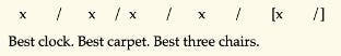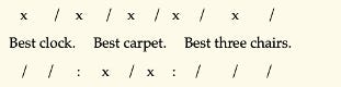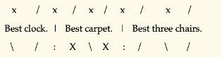 This performance - to exaggerate, ‘Best clock uh Best car-pet uh Best three chairs’ – instead distributes the silence of the missing foot between the objects the line describes. Here, the first ‘best’ is a tensive strong; the second is a tensive weak, and the third is back up to a full strong. (‘Tensive’ doesn’t just mean ‘a syllable fighting with the metre’ but also means ‘totally unstable re how you choose to perform it’.) Here, the first two ‘bests’ are tensive, but in opposite directions (demoted strong [\], promoted weak [X]); the last ‘best’ is emphatic. The pub-fight would be over the way I’ve placed the word ‘carpet’, i.e. so wrongly against the metre, it just looks misaligned: you’re obviously not going to say ‘best carPET’, but nonetheless I think it strains against its wrong position expressively, and its weak/strong stresses can be more even than usual. That’s all a scansion is – a sort of self-justifying explanation of your performance preference. Don’t let ‘em tell you otherwise. A science it is not, but it is a bit of an art.